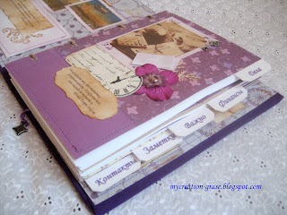А дальше о самой работе: органайзер размером 22х17, в коробочке, пять разделов (Дела, Финансы, Важно, Заметки, Контакты), два кармашка для мелочей на форзацах, язык - русский, мякгая тканевая обложка. Пожеланием Вики было использование сиреневых тонов, что и постаралась исполнить:)